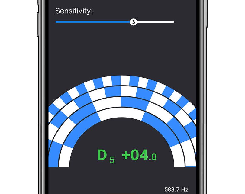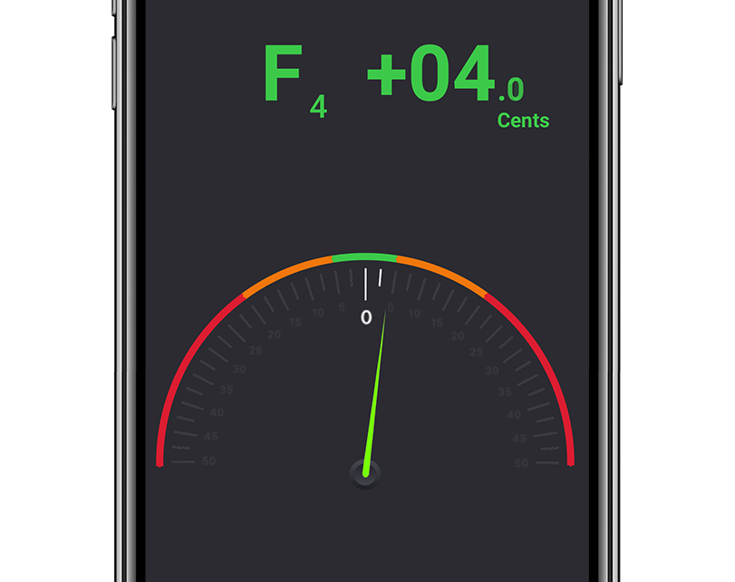 Custom strobe design that moves left for flat and right for sharp. The more out of tune you are, the faster the strobe wheel moves. Different sensitivities are there to challenge you.