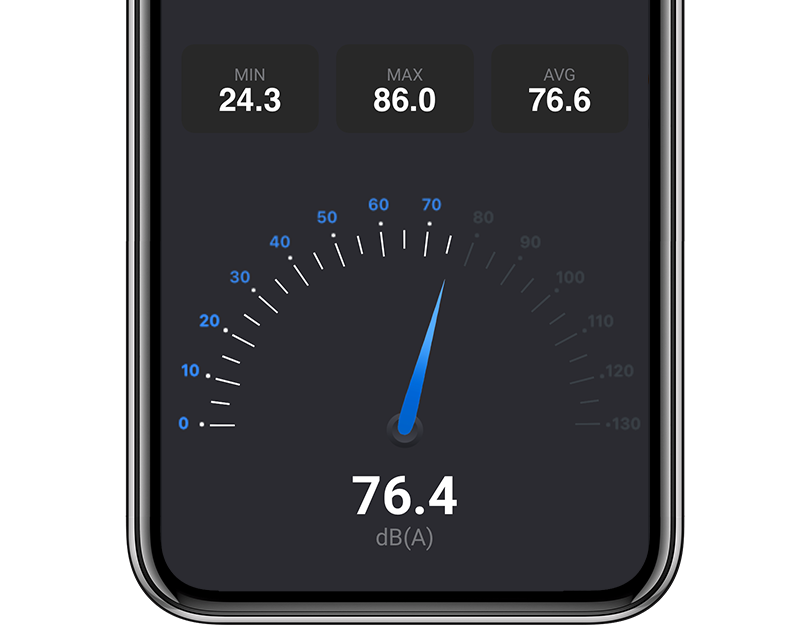 Decibel gauge using A-Weighting to simulate loudness perceived by the human ear. Simple user interface showing the minimum, maximum, and average decibel.