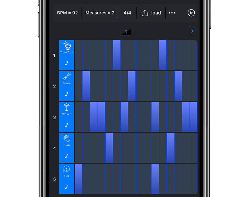 Create multiple tracks each with their own instrument and rhythm. Over 20 different instruments to choose from. Create backing tracks to any genre of music.
