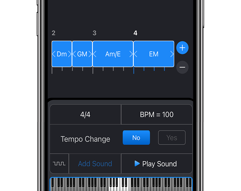 Customize your own drone track by selecting the chords you want. Practica will automatically detect the chord symbol. A musician can easily add a click to your drone track. Great for practicing intonation.